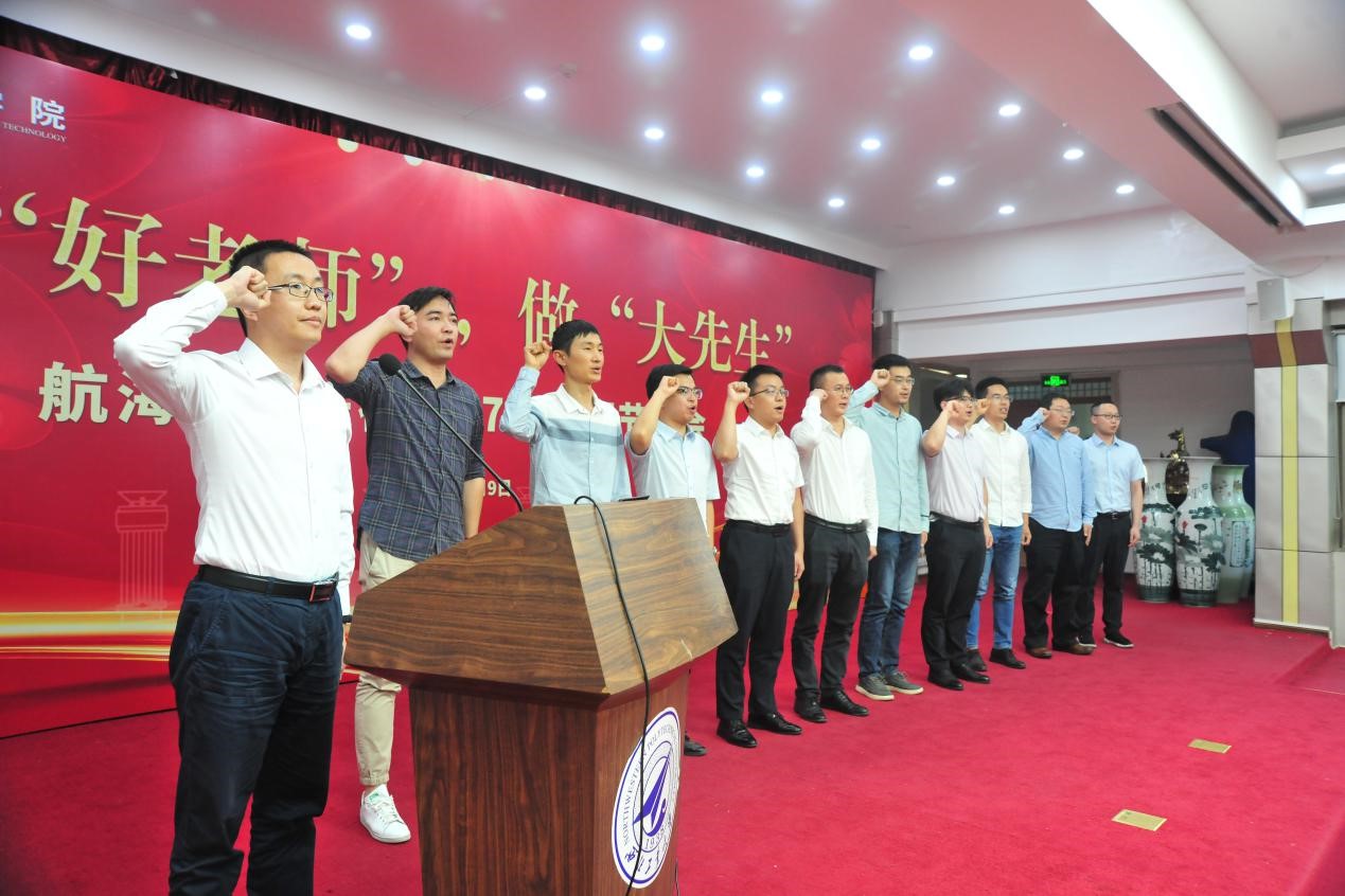 青年教师是学院发展的生力军,是学院向前迈步、走向未来的新鲜血液。学院新进教师面对誓词,在领誓人黄潇的带领下,庄严宣誓。