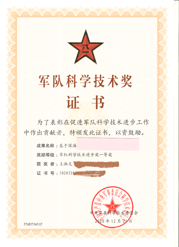 班级成员王淑文在国家海洋重大专项的研究中,从项目申请阶段的材料收集、申请材料的准备,到重点专项中关键技术的仿真计算与实验验证均参与其中,并做出突出贡献。其本人作为学生第一负责人荣获军队科学技术进步一等奖。