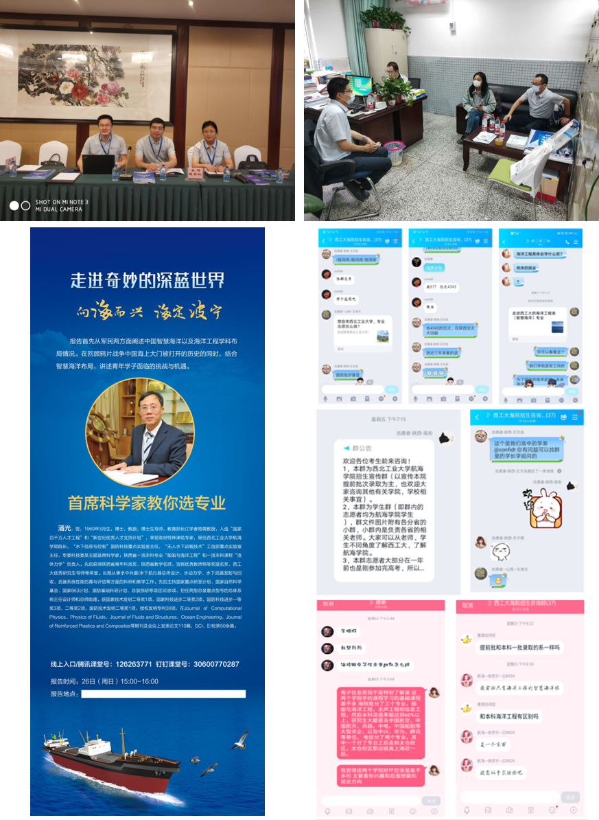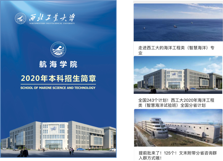 2020年本科招生简章》。另外,积极发挥线上宣传的优势,在我院“海之声”公众号上推出主题为“走进西工大的海洋工程类(智慧海洋)专业”、“全国243个计划!西工大2020年海洋工程类(智慧海洋试验班)分省计划”、“提前批来了!125个!文末附带分省咨询群入群方式哦!”三个线上微信推送等。