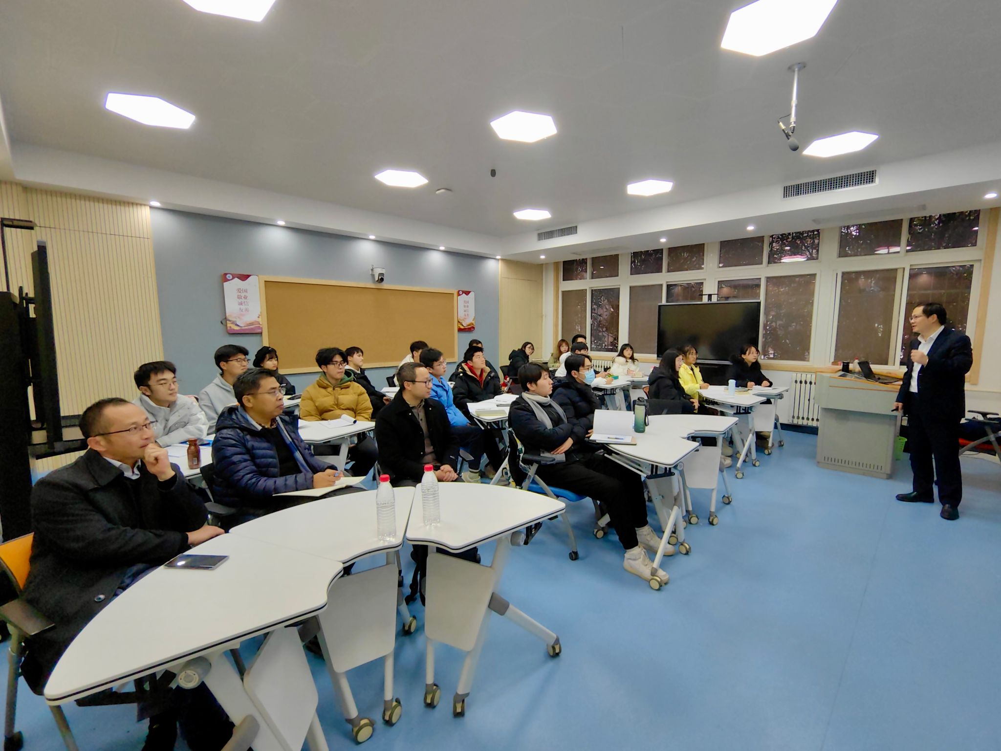 党委书记孙华强、党委副书记王银涛、辅导员郭兵勇与学院大三年级预备党员共同聆听本次思政课。